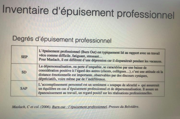 Pour toi qui a déjà repris le travail, ou va le reprendre, je te suggère cet inventaire d’épuisement professionnel de Maslach. Il est constitué de 22items (voir les photos ci-dessous)Surtout ne reste pas seul face à une situation stressante. N’hésite pas à en parler à tes proches pour avoir des avis, à la personne concernée (si c’est elle qui te stress), propose des solutions, inspire plusieurs fois par le nez en retenant 5scd puis expire par la bouche jusqu’à calmer ton pouls, prends soin de toi, évite de boire « trop » de café ( oui, parce que ça te booste qu’un court temps et après tu es à plat, peut-être même addict), si la fatigue se fait sentir n’hésite pas à aller au lit… si ton stress persiste tu peux aussi consulter : coach de vie, psychologue, hypnotiseur, … la liste est longue.